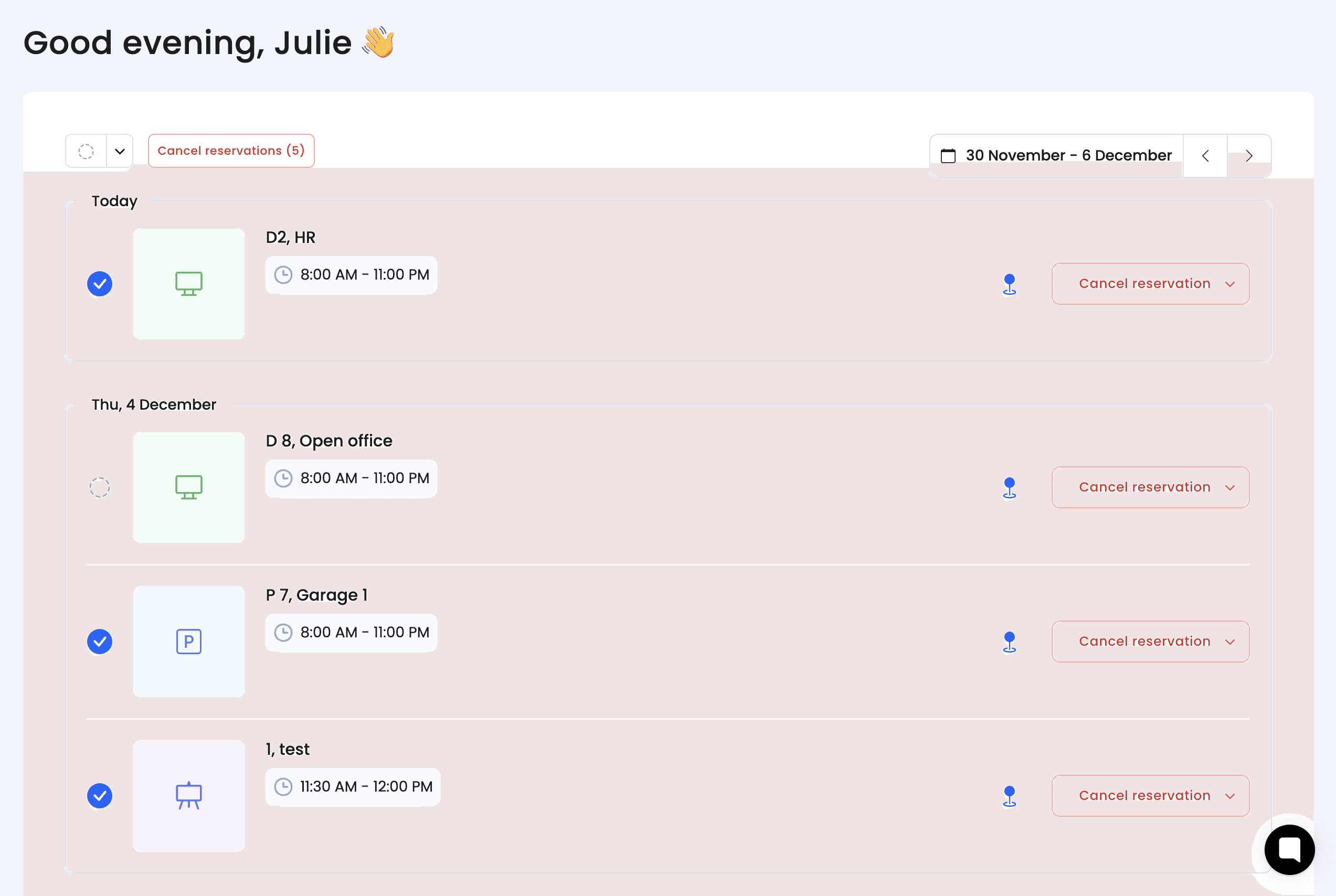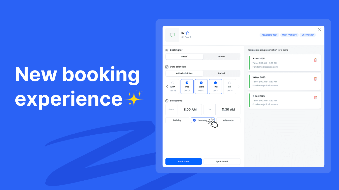 We've completely redesigned how you book desks and parking from the ground up. The new streamlined process lets you select your spot, pick multiple days in one go, and confirm—creating several reservations in a row with way fewer clicks. No more repeating the same booking flow over and over for each day you need.