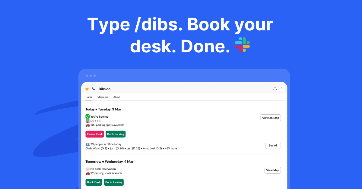 Our Slack app just got a major upgrade. If your team lives in Slack, you can now call dibs on a desk or parking spot without ever switching to another app. Just type /dibs desk today and your favorite desk is automatically reserved. Need parking? /dibs parking monday. One command, one second, done.